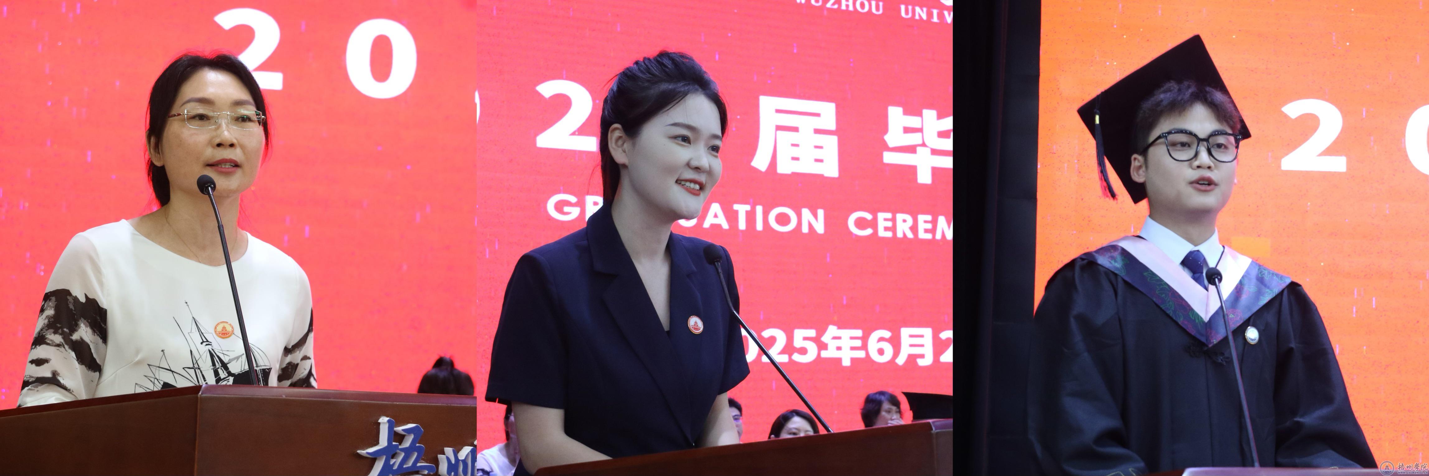 法学院2021级法学1班梁海润代表2025届毕业生发言,他回顾了四年大学的生活点滴,感恩母校悉心栽培,并表示将会把校训内化外行,在青春奋斗中立身赋能、笃行致远。食品与制药工程学院教师石金娥代表教师发言,她勉励广大毕业生踔厉奋发,在祖国大地书写奋斗新篇章。我校2017级视觉传达设计专业毕业生裴一凡代表我校毕业校友发言,她深情回顾了从事壁画工作的历程,感恩母校、师长们的谆谆教诲,激励毕业生找寻热爱、脚踏实地、行稳致远。