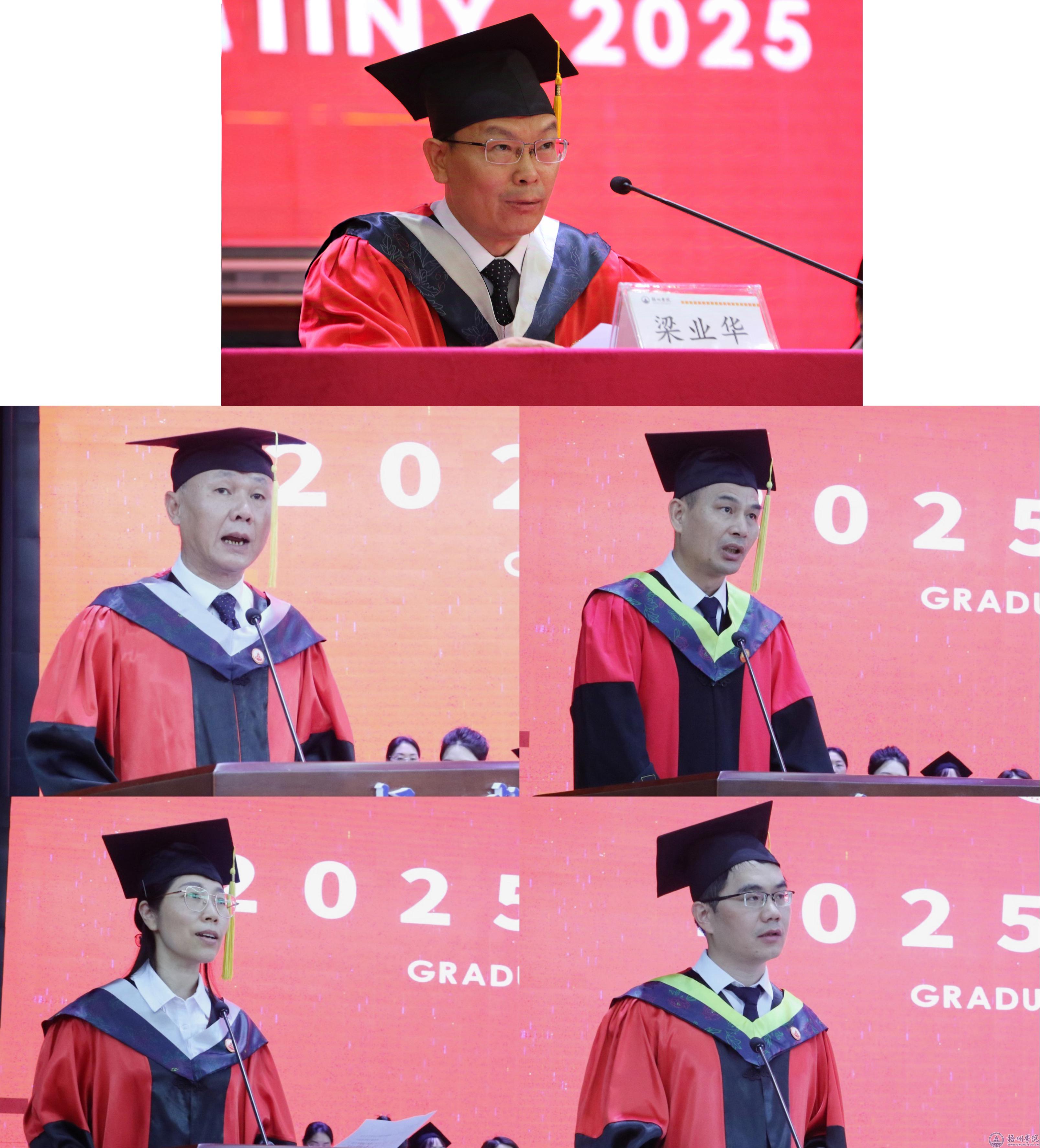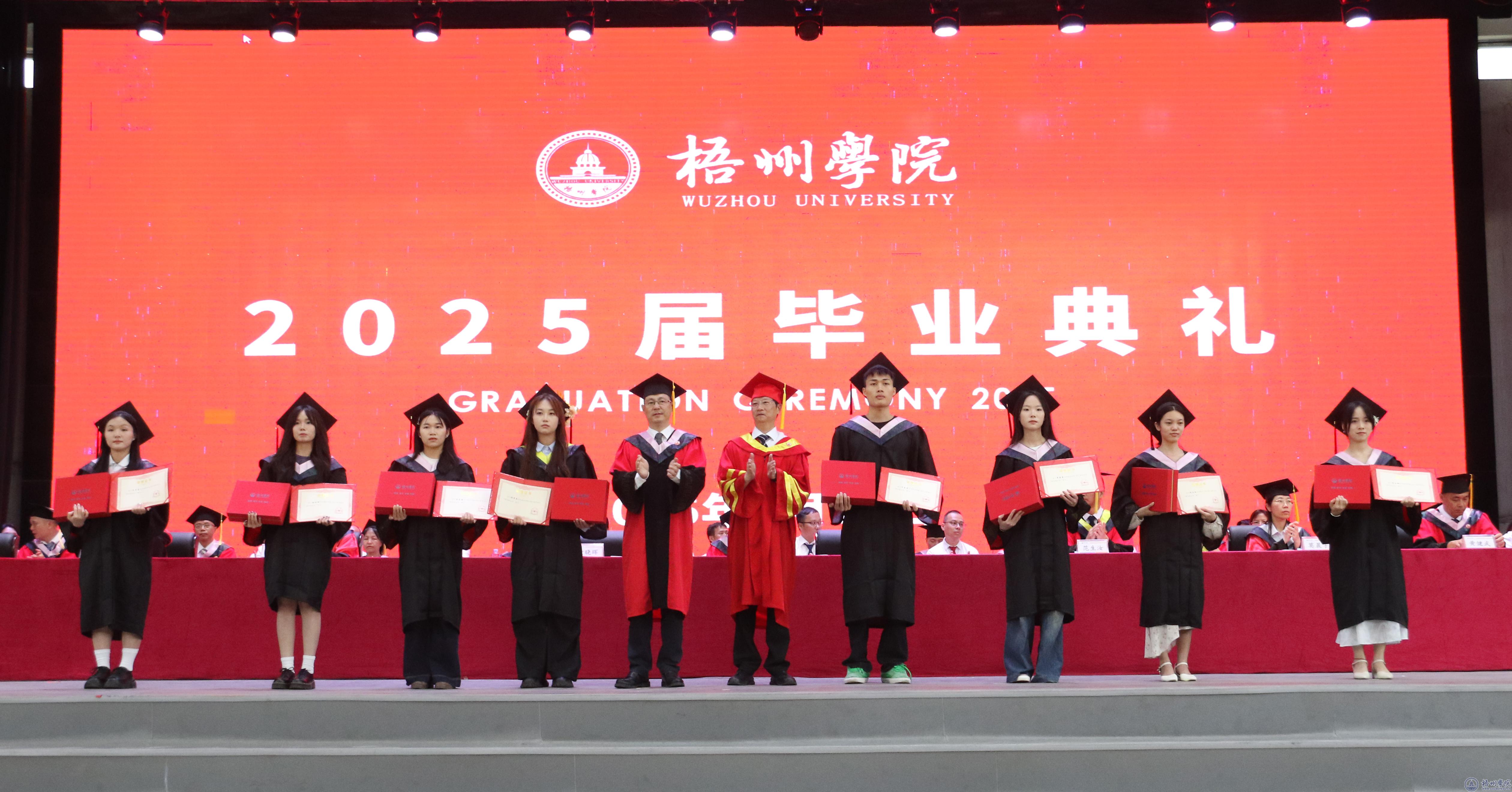 典礼在庄严的国歌声中拉开帷幕。副校长覃雄彪宣读我校关于准予2025届普通全日制本专科学生毕业文件,学校领导为毕业生代表颁发毕业证书。副校长范生汝宣读自治区教育厅关于认定优秀毕业生文件及名单,学校领导为区级优秀毕业生代表颁发荣誉证书。副校长莫晨宇宣读我校关于表彰优秀毕业生文件,学校领导为校级优秀毕业生代表颁发荣誉证书。副校长邓小林宣读我校2025届普通高等教育毕业生考取硕士研究生名单,党委书记童晓晖和校长麻新纯为考取硕士研究生的毕业生颁发荣誉证书。