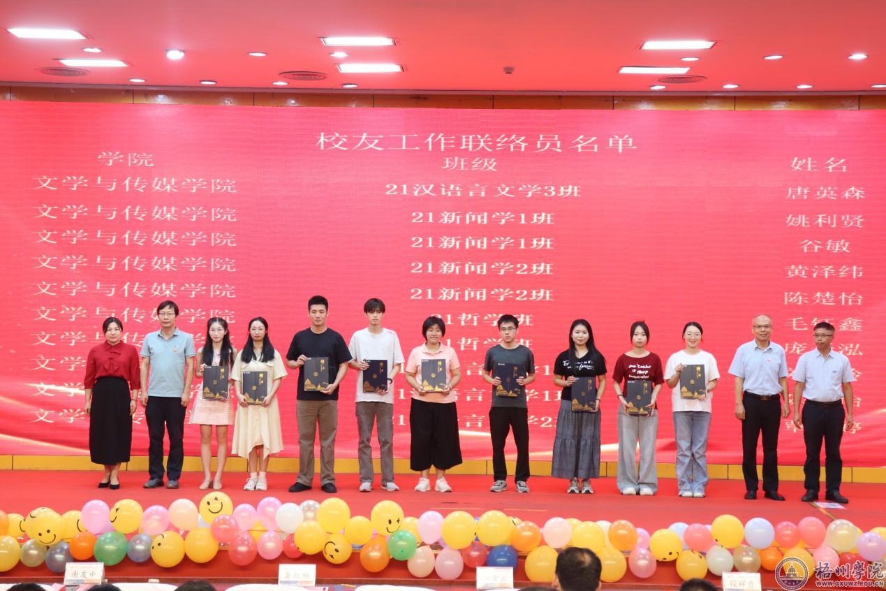 活动在温馨的毕业生祝福视频中拉开序幕。学生代表演唱的歌曲《凤凰花开的路口》,用歌声诉说毕业的不舍与对未来的期许;语艺团成员带来的朗诵《有你的夏天》,以深情的话语带大家回顾校园美好时光。在颁奖仪式环节,学院党委书记梁宏云宣读获奖毕业生名单及获聘校友工作联络员名单,学院领导分别为获奖及获聘毕业生颁发荣誉证书及聘书,表彰他们在校期间的优异表现,希望他们发扬“文心传道 力行致远”的院训精神。教师代表寄语毕业生,希望他们在未来的道路上坚守初心、勇于拼搏;优秀毕业生代表分享在校成长经历,表达对母校的感恩;校友工作联络员代表表示将积极搭建校友与母校的沟通桥梁。学院副院长(主持工作)段祥贵在讲话中鼓励毕业生以梦为马、不负韶华,在新征程中书写精彩人生。