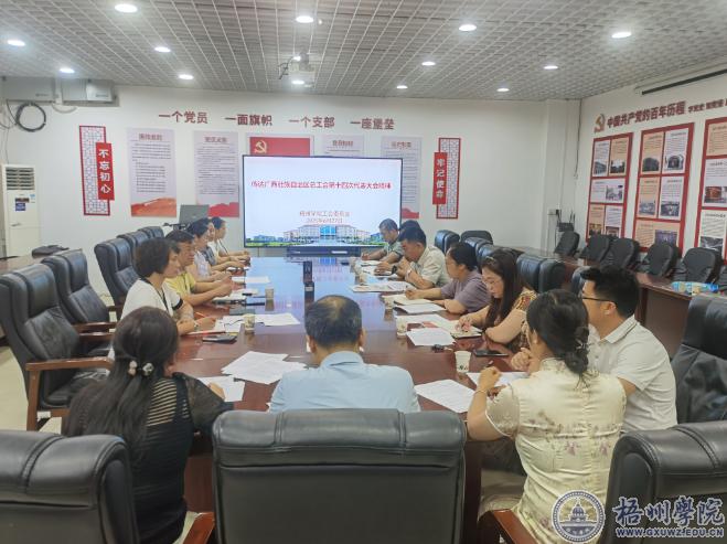 6月16日至6月19日,广西工会十四次代表大会在广西人民大会堂胜利召开。自治区党委书记陈刚同志在开幕式作重要讲话,自治区人大常委副主任、自治区总工会主席黄伟京作题为《以习近平新时代中国特色社会主义思想为指导 团结动员全区职工为奋力谱写中国式现代化广西篇章努力奋斗》的工作报告。为更好的贯彻落实好此次会议精神,团结和引领我校教职工建功新时代,2025年6月27日上午校工会委员会召开专题会议,广西工会十四大代表、校工会常务副主席彭赞文向梧州学院工会委员传达了广西工会十四大精神。