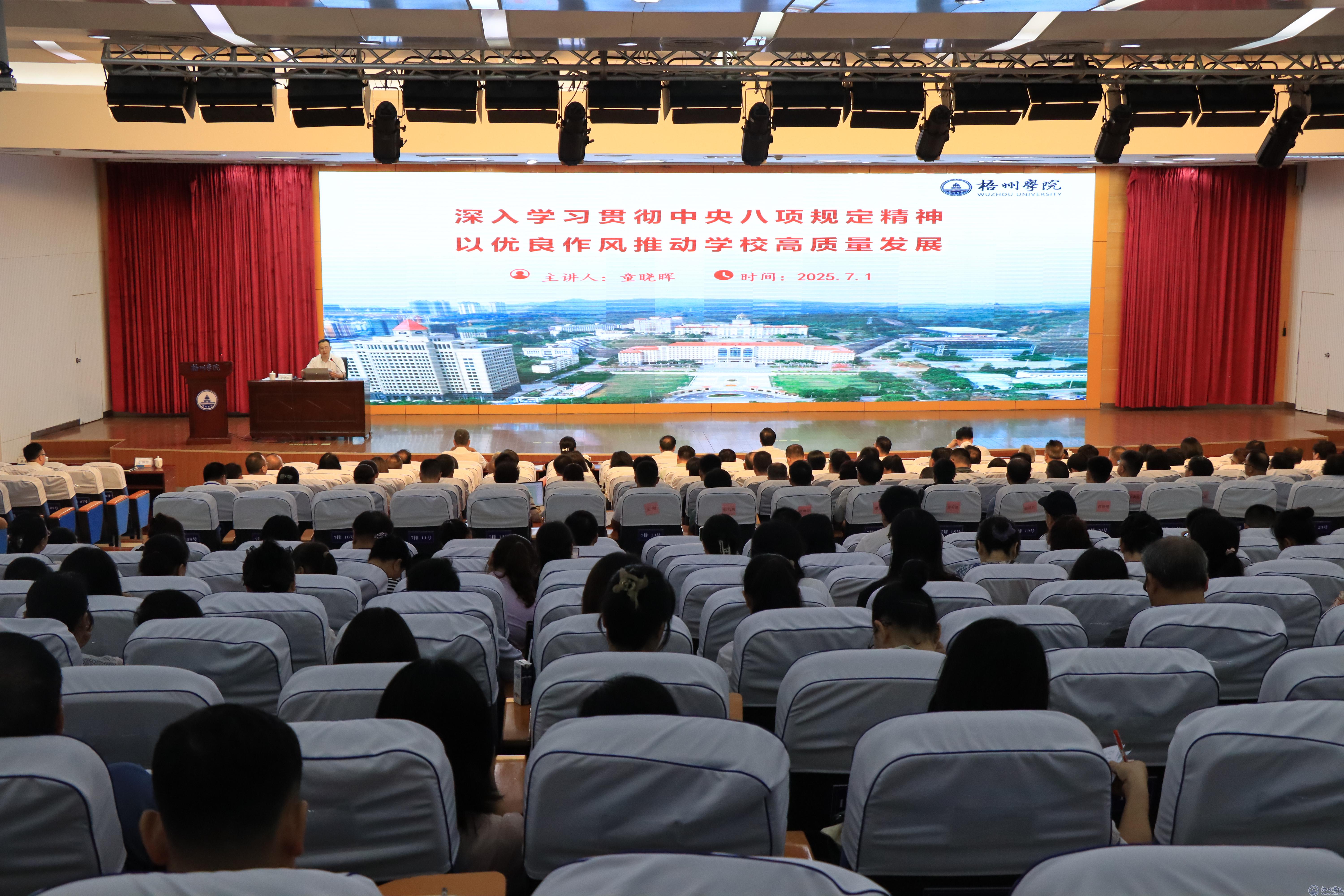 会上,学校党委书记童晓晖作《深入学习贯彻中央八项规定精神,以优良作风推动学校高质量发展》专题党课。童晓晖书记从开展深入贯彻中央八项规定精神学习教育的重大意义;党的十八大以来深入贯彻中央八项规定精神的成效和经验;一体推进学查改,以优良作风推动学校高质量发展成效;进一步推进学习教育走深走实的工作要求等四个方面进行论述。他指出,党实现长期执政,需持之以恒地推进作风建设,紧密维系党同人民群众的血肉联系。他强调,中央八项规定是以习近平同志为核心的党中央推进全面从严治党的一张耀眼金色名片。作为高校教育工作者,我们肩负着立德树人的神圣使命,学校的作风建设直接关乎人才培养质量、办学质量、水平以及事业发展。当前,学校正处于高质量发展的关键时期,更需要我们深入贯彻中央八项规定精神,持之以恒地纠正“四风”、树立新风,为落实立德树人根本任务、建设高水平大学提供坚实有力的保证。