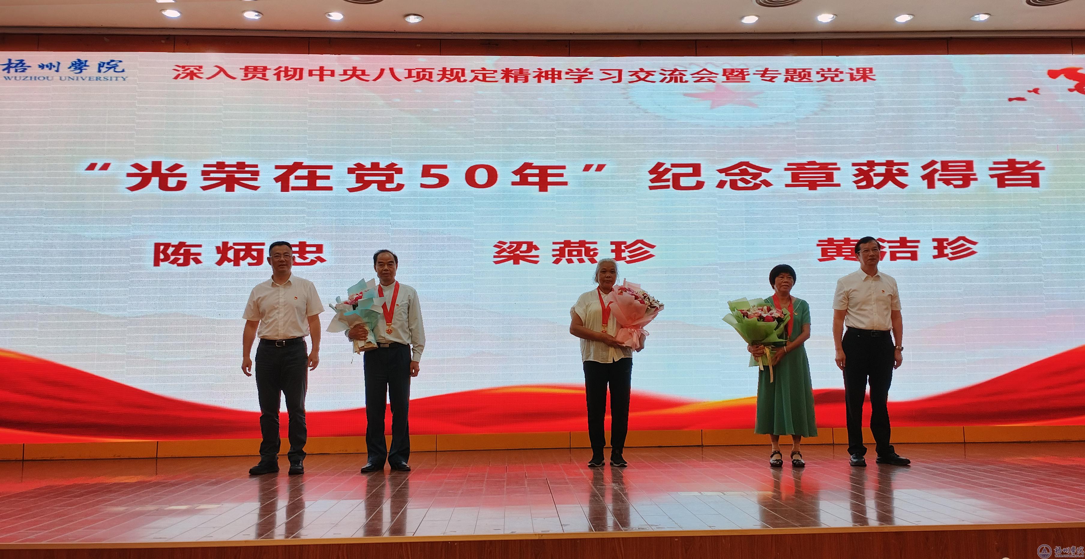 校党委书记童晓晖、校长麻新纯为陈炳忠、梁燕珍、黄洁珍同志颁发“光荣在党50年”纪念章