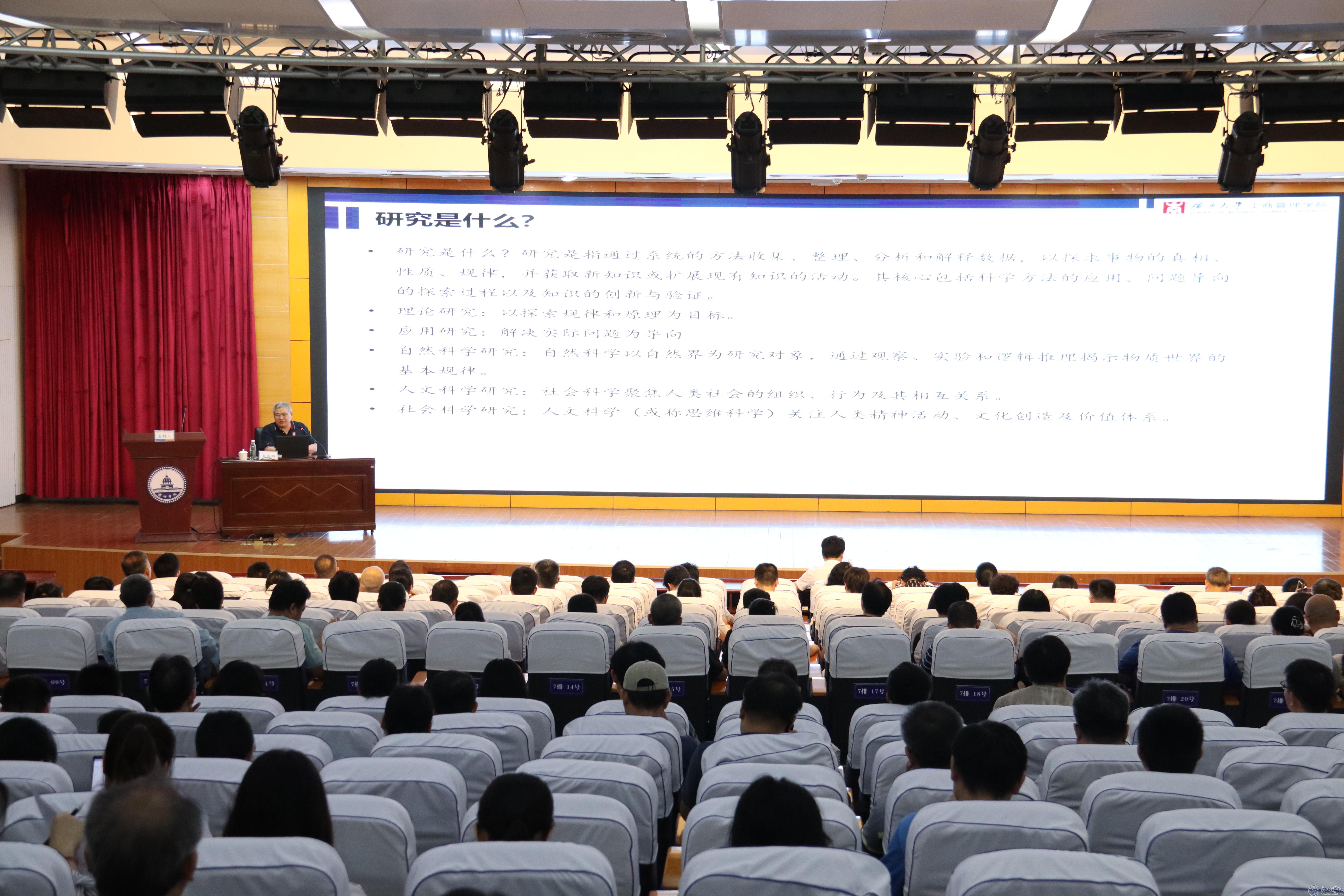 朱教授强调,新时代背景下的人文社会科学研究,需具备时代性与先进性,兼具实用价值,同时要服务于学科建设和人才培养。针对如何做好人文社会科学研究,他提出了一系列切实可行的建议:做好顶层设计,推动有组织科研与自由探索相结合;制定全方位的支撑政策;重构人力、物力、财力资源配置;实施分类评价机制;密切关注国家与地方政策动态;重视研究方法的创新与运用;加强学术交流与合作。为让听众更直观地理解相关研究方法,朱教授以经济管理类论文结构为范例,详细解读了国外核心论文的撰写方法。他还介绍了广西大学在应用该方法过程中,在学风建设、教风塑造、教学科研服务质量提升以及学校影响力与美誉度增强等方面取得的显著成效,为我校提供了宝贵借鉴。