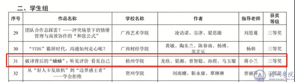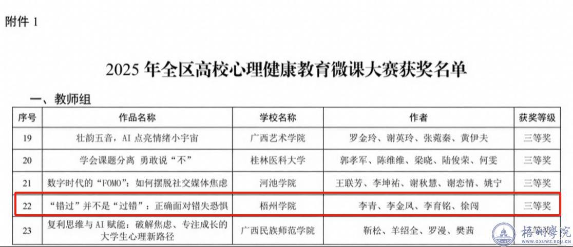近日,自治区教育厅公布了2025年全区高校大学生“3·25”心理健康教育活动季活动获奖名单,我校在心理健康教育微课大赛中,获得佳绩,其中:教师组作品《“错过”并不是“过错”:正确面对错失恐惧》荣获三等奖,学生组作品《破译背后的蛐蛐:听见评价,看见自己》荣获三等奖。