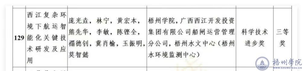 近日,广西科学技术奖励委员会办公室公布了《广西科学技术奖励委员会办公室关于公布2024年度广西科学技术奖奖励名录的通知》。我校庞光垚、黄宏本、冀肖榆、玉振明、莫智懿等研发的“西江复杂环境下航运智能化关键技术研发及应用”成果荣获广西科学技术进步奖三等奖。