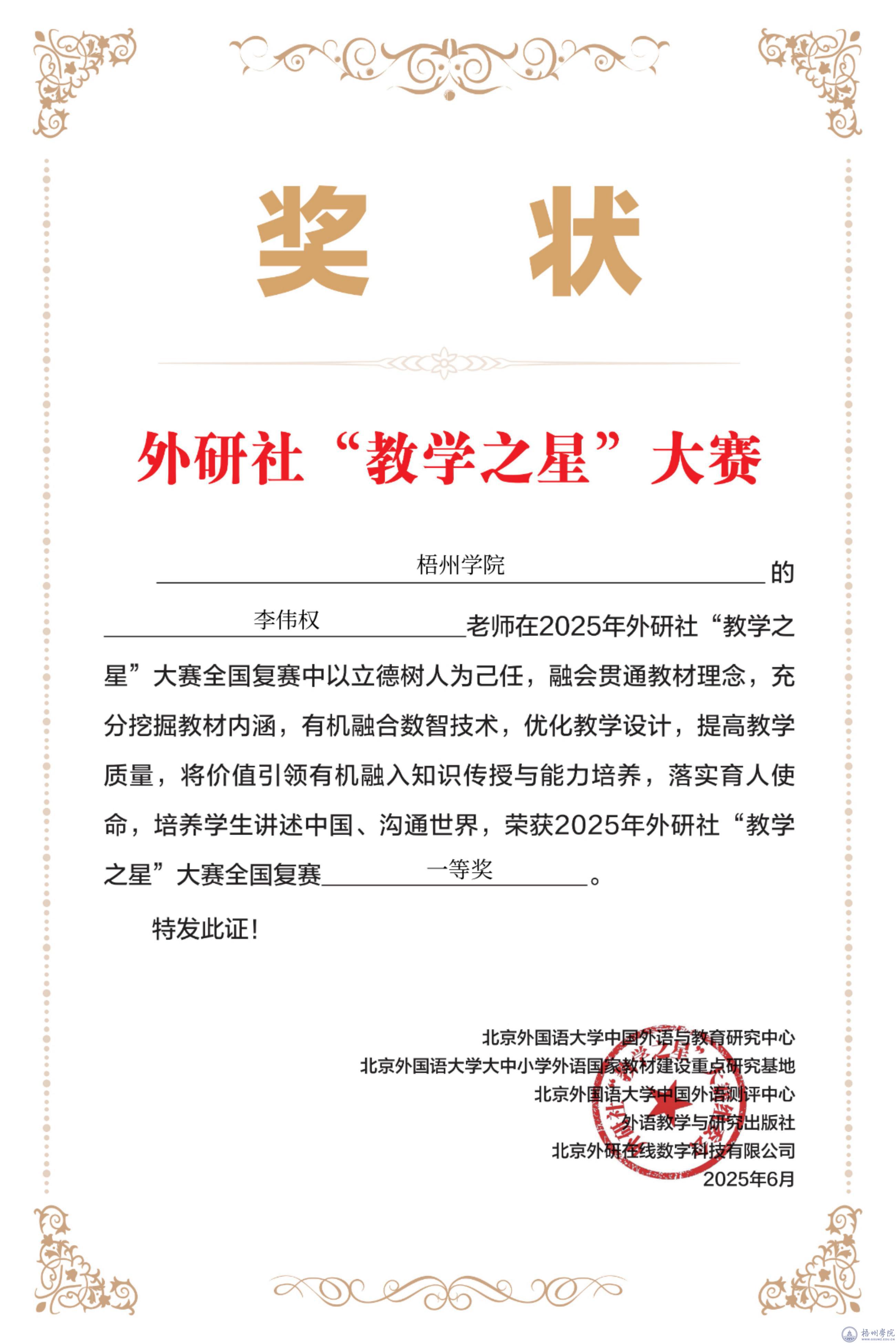近日,外国语学院李伟权教师团队与曾秦教师团队在2025年外研社“教学之星”大赛全国复赛中荣获大学英语组一等奖与英语类专业组一等奖。