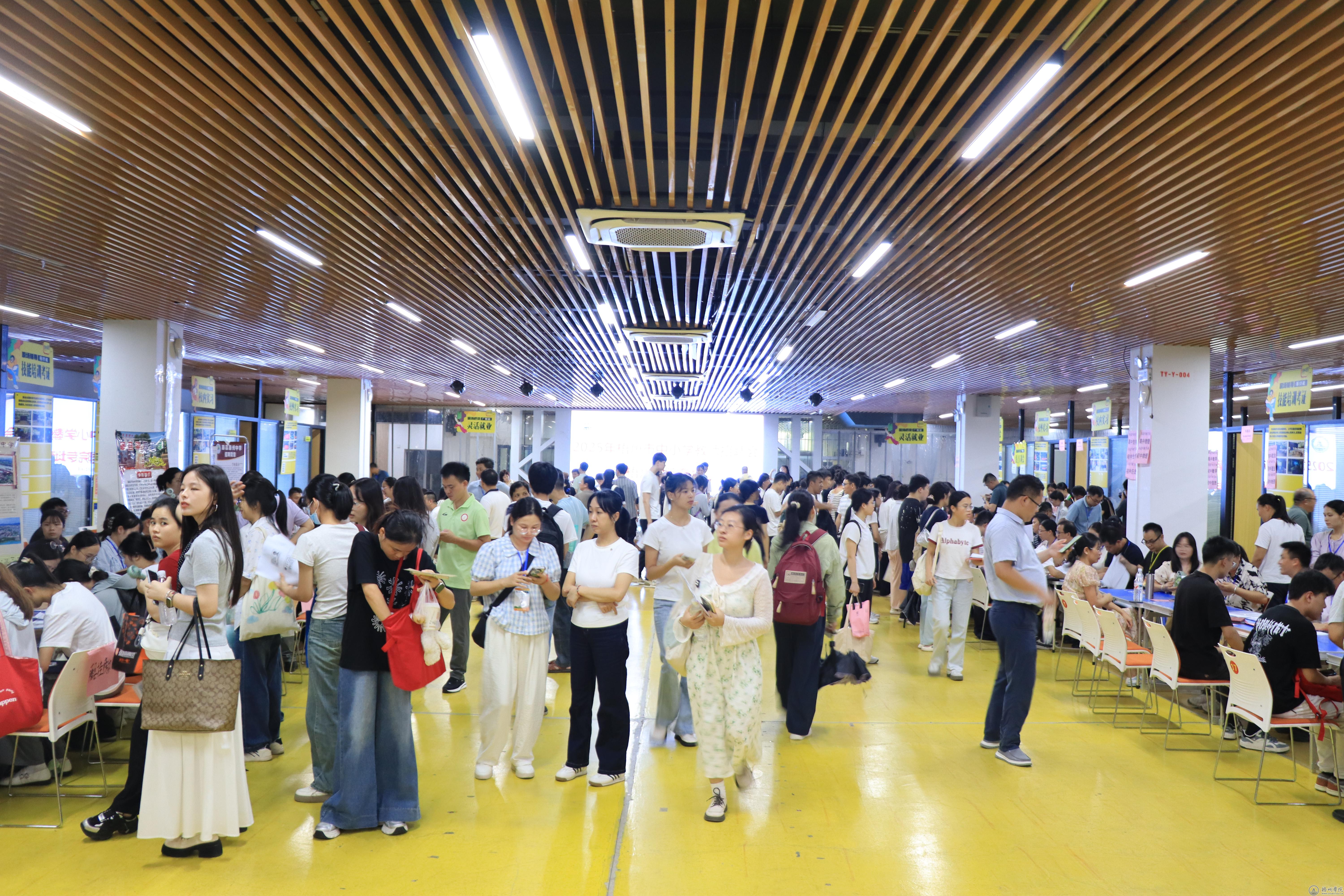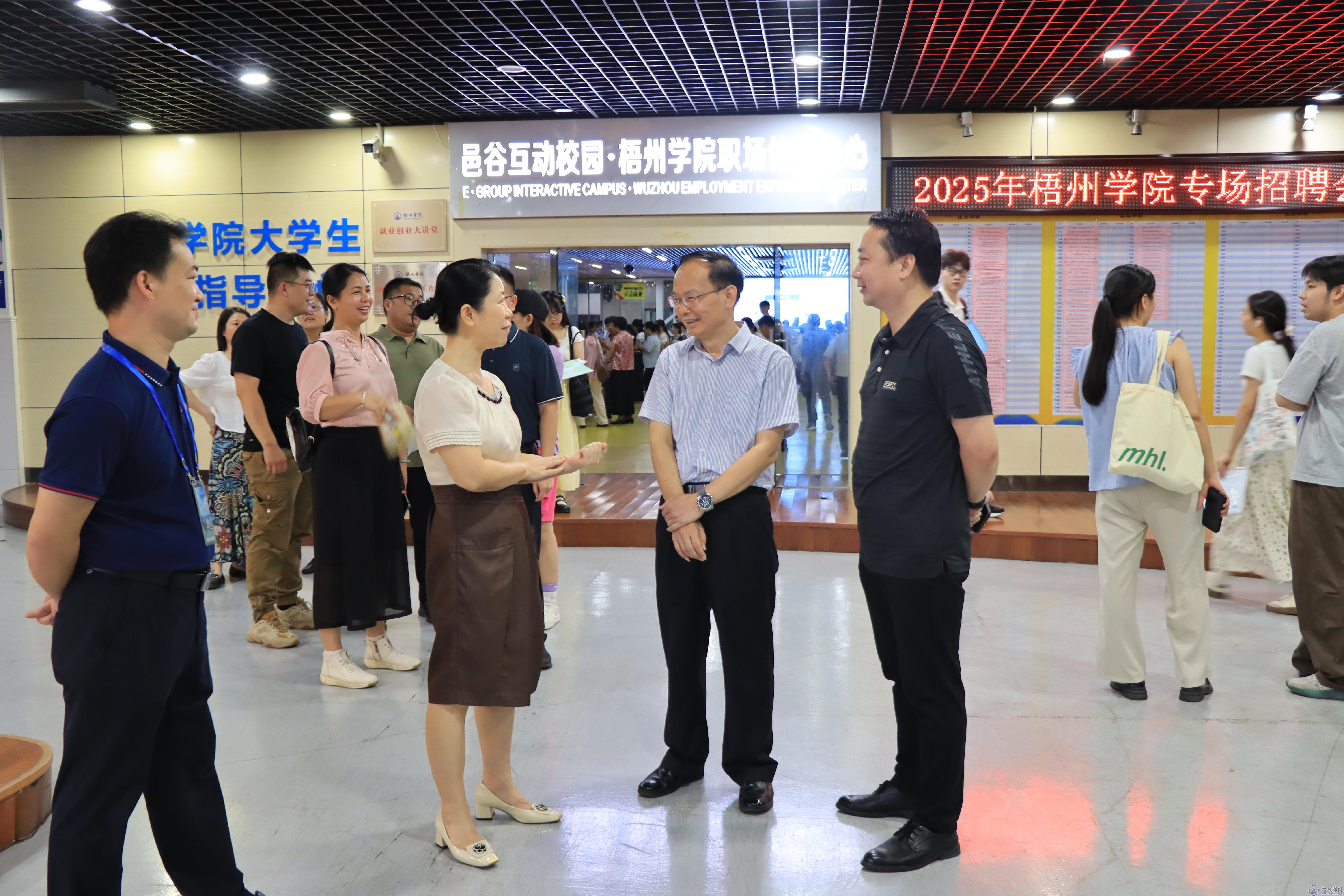 7月26日,2025 年梧州市中小学专任教师招聘会(梧州学院专场)在我校体育馆负一楼举办。学校党委副书记梁业华,梧州市教育局局长覃映霞到现场指导工作,与招聘单位、应聘学生深入交流,了解招聘进展与需求。