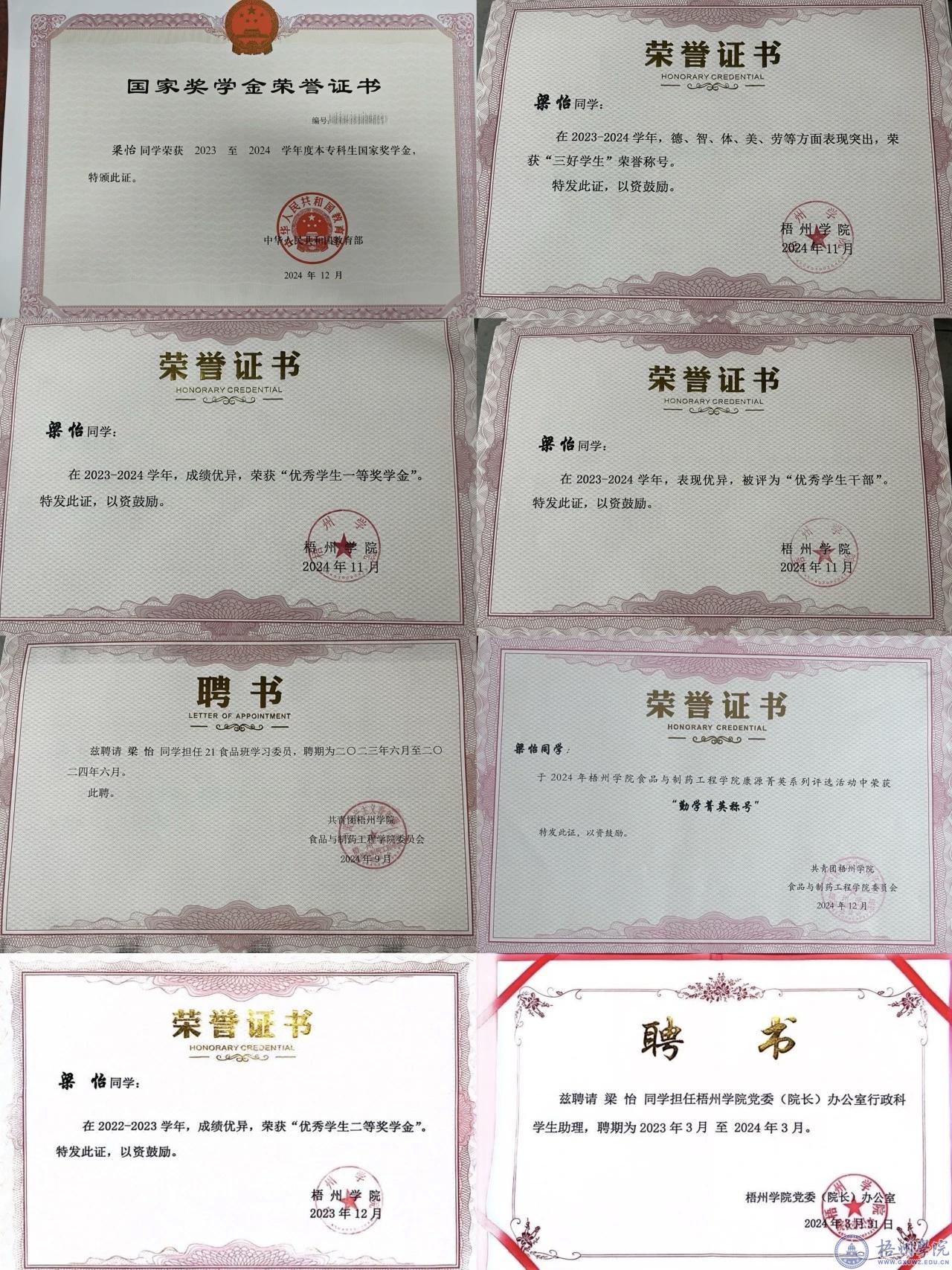 梁怡,梧州学院食品与制药工程学院2021级食品科学与工程班学生,食品与制药工程学院2021级成绩绩点排名第一,中共预备党员,2023-2024学年国家奖学金获得者,在校期间,曾获梧州学院“军训优秀人员”、“优秀学生一等奖学金”、“优秀学生二等奖学金”、“优秀学生干部”、“三好学生”、梧州学院“筑梦助飞创新广西”大学生创业支持大赛铜奖、梧州学院食品与制药工程学院康源菁英“勤学菁英”等奖项。