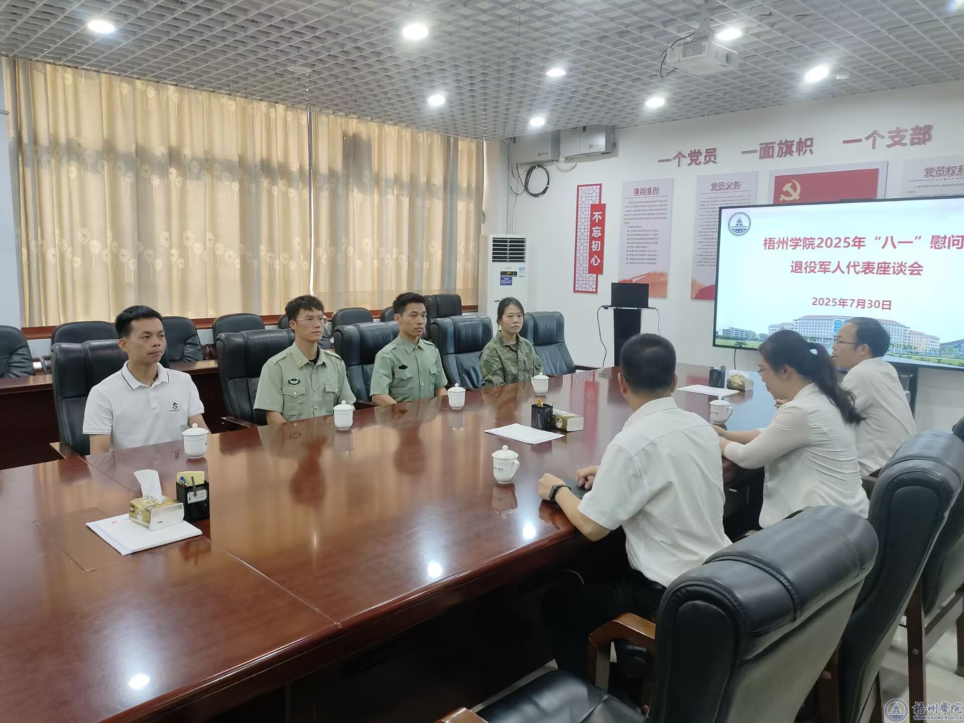 在庆祝中国人民解放军建军98周年之际,为大力弘扬拥军优属光荣传统,营造尊崇军人、关爱退役军人的浓厚校园氛围,7月30日下午,学校武装部牵头在体育馆一楼学工团委党支部党员活动室组织召开了退役军人教职工和退役大学生代表交流座谈会。