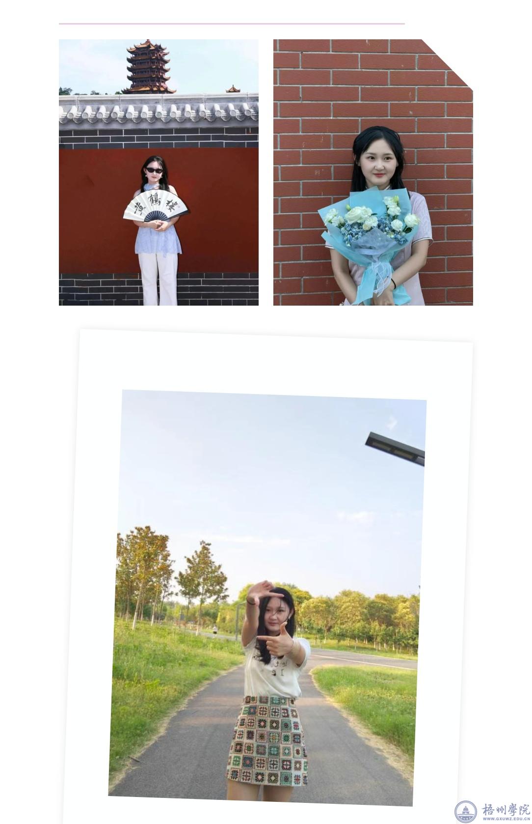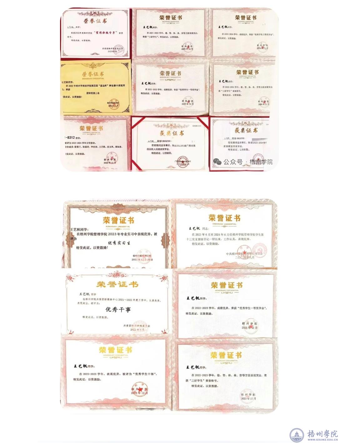 王艺帆,2021级管理学院公共事业管理本科班,中共党员,2021级管理学院绩点成绩排名第一。曾任管理学院行政管理专业学生第二党支部副书记、新媒体中心干部、校团委干部等职务。曾获“广西壮族自治区人民政府奖学金”,“国家励志奖学金”,优秀学生三等奖学金,连续两年获得管理学院顺鑫义信奖学金,连续两年获得梧州学院”“优秀学生一等奖学金”,连续三年获梧州学院“三好学生”,和“优秀学生干部,获得校级优秀毕业生,区级优秀毕业生”等荣誉称号。2025年6月,以352分考取广西大学法律(非法学)方向硕士研究生。