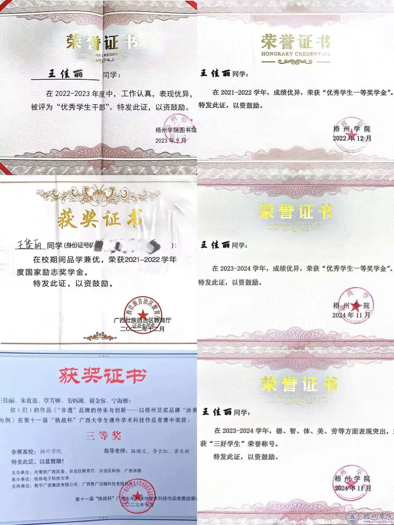 在大二下学期,王佳丽参加了第十一届广西“挑战杯”,作为团队负责人的她,所有的精力几乎都投入到了这个比赛中,在学习和比赛的双重压力下,每天都在无缘无故地焦虑,没有一点学习状态,这直接影响到了她的学习。面对这种情况,她并没有放弃,而是咬牙继续坚持,在她的努力下,她和她的团队获得了第十一届广西“挑战杯”课外学术科学竞赛区级三等奖。“真的很感谢坚持下来的自己。”王佳丽说道。