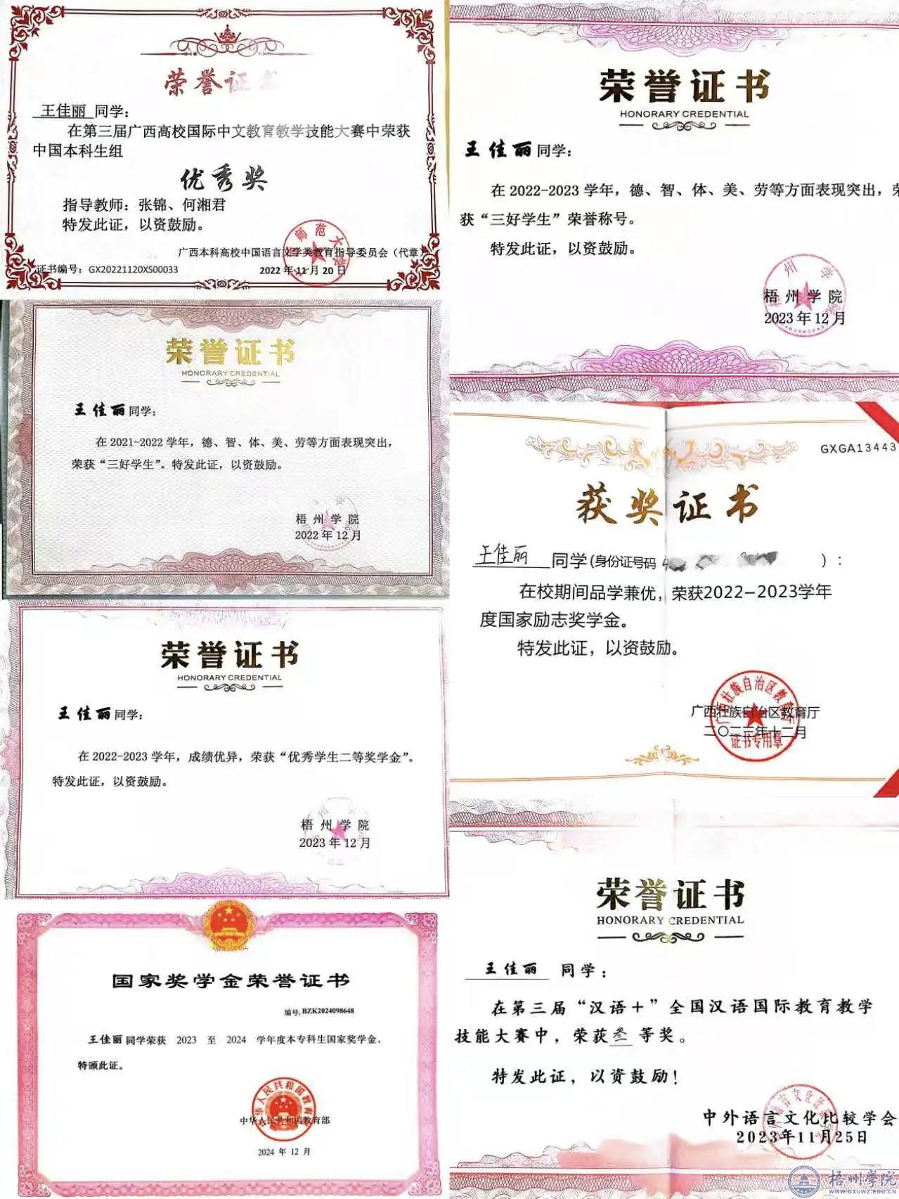 王佳丽,中共党员,学校文学与传媒学院2021级汉语国际教育1班。曾获得第三届“汉语+”全国汉语国际教育教学技能大赛三等奖、第三届广西国际中文教育教学技能大赛优秀奖、第十一届广西“挑战杯”课外学术科学竞赛区级三等奖,连续三年获梧州学院三好学生称号、优秀学生一等奖学金,优秀学生二等奖学金;连续两年获国家励志奖学金、获2023-2024学年国家奖学金、2025届广西自治区级优秀毕业生等荣誉。