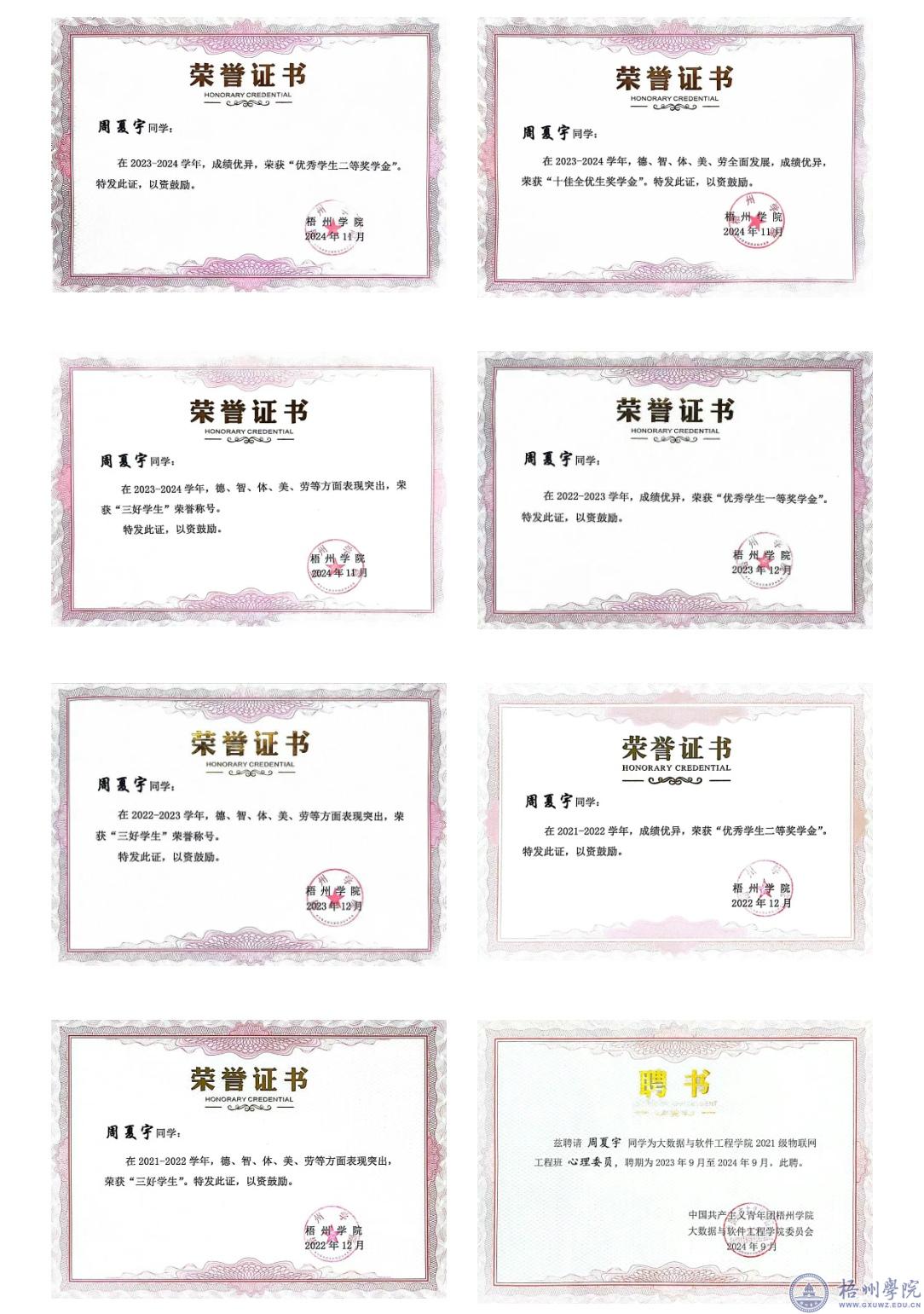 周夏宇,男,我校大数据与软件工程学院2021级物联网工程班学生,大数据与软件工程学院2025届毕业生成绩绩点第一。在校期间,他曾获国家励志奖学金、优秀学生奖学金,连续三年获评“三好学生”。先后担任过班级实践委员和心理委员,在华为杯华中及西南赛区斩获二等奖,两次参加广西大学生人工智能设计大赛均获二等奖,2023年参与国家级重点支持领域项目“基于云平台的连续变倍单摆臂体式显微镜远程示教系统的设计与开发”。