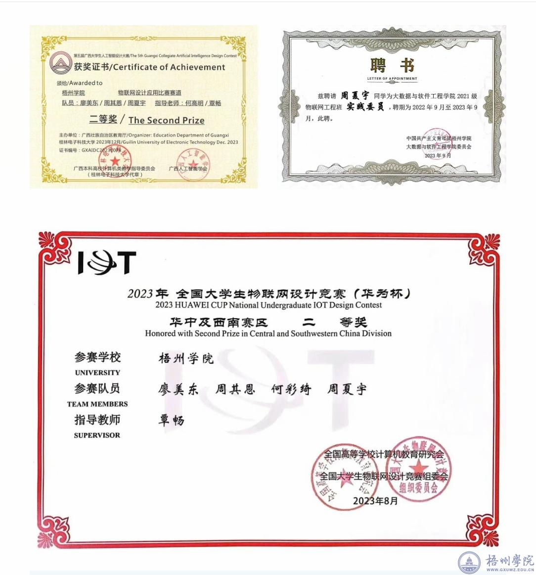 “单丝不成线,独木不成林。”学科竞赛是周夏宇大学生活中浓墨重彩的一笔。在周夏宇的竞赛经历中,团队合作是贯穿始终的关键词。提到两次斩获广西大学生人工智能设计大赛二等奖,周夏宇表示,除了收获荣誉,更加强了他的团队协作能力。从第一次吸取学长学姐的经验,到第二次将这份经验传承给学弟学妹,赛场让他完成了从“学习者”到“引领者”的蜕变。在华为杯华中及西南赛区的比赛中,赛场上有许多来自其他高校的团队,他表示“能看到别人做的项目是什么样子,借鉴他们好的学习方向,以此来提升自己的能力。”